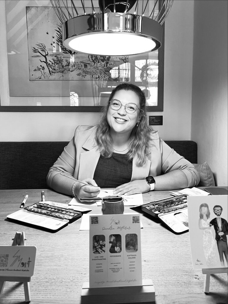 Hallo und herzlich willkommen! Ich bin Sandra, Künstlerin aus Leidenschaft, und mein Ziel ist es, Deine besonderen Momente auf einzigartige Weise festzuhalten. Mit Eventpainting, Fotografie und individueller Auftragsmalerei schaffe ich Kunstwerke, die berühren und für immer in Erinnerung bleiben.
